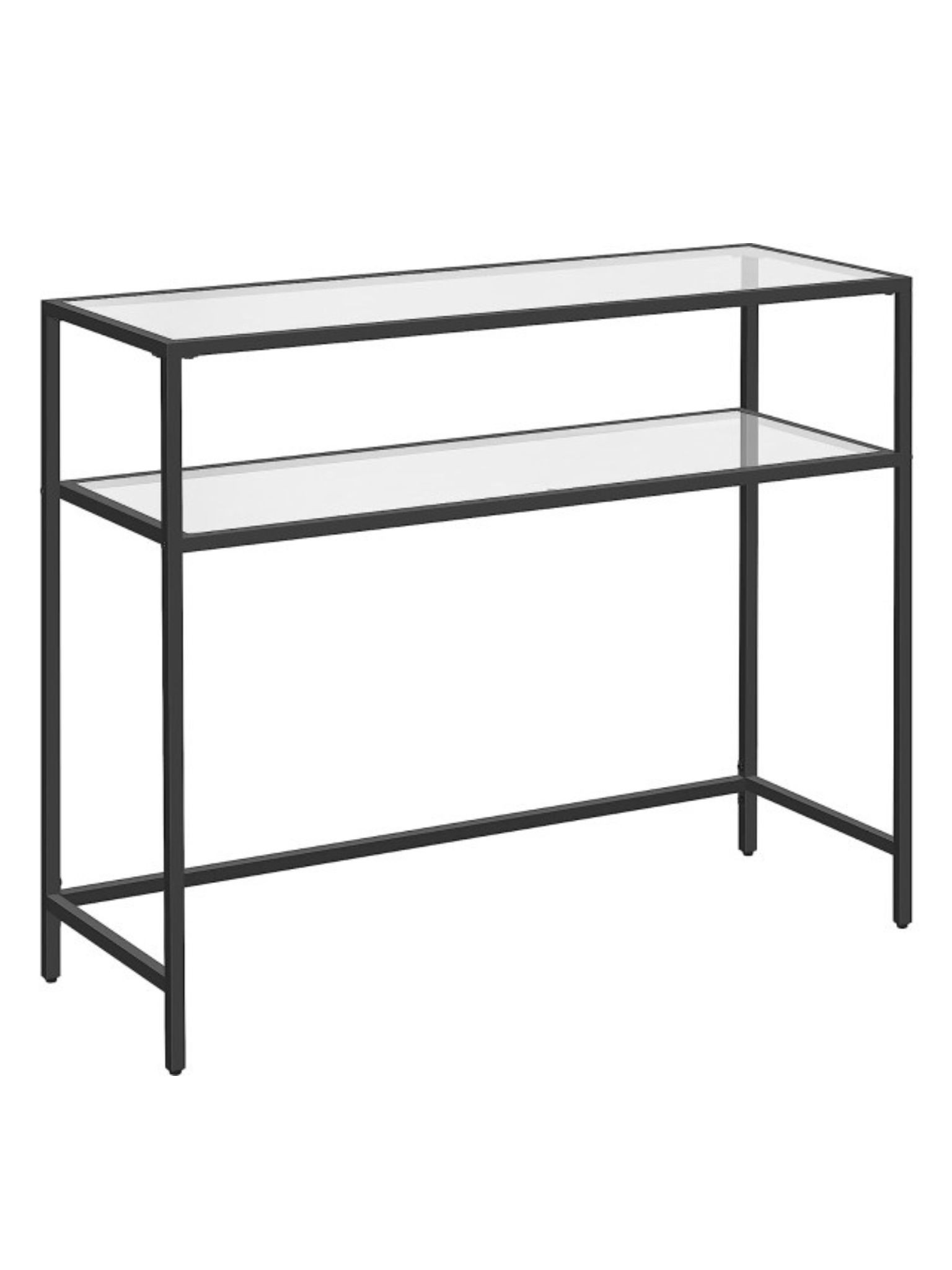 Černý konzolový stolek se skleněnou poličkou. Na obřad nebo odložení sklenky prosecca.